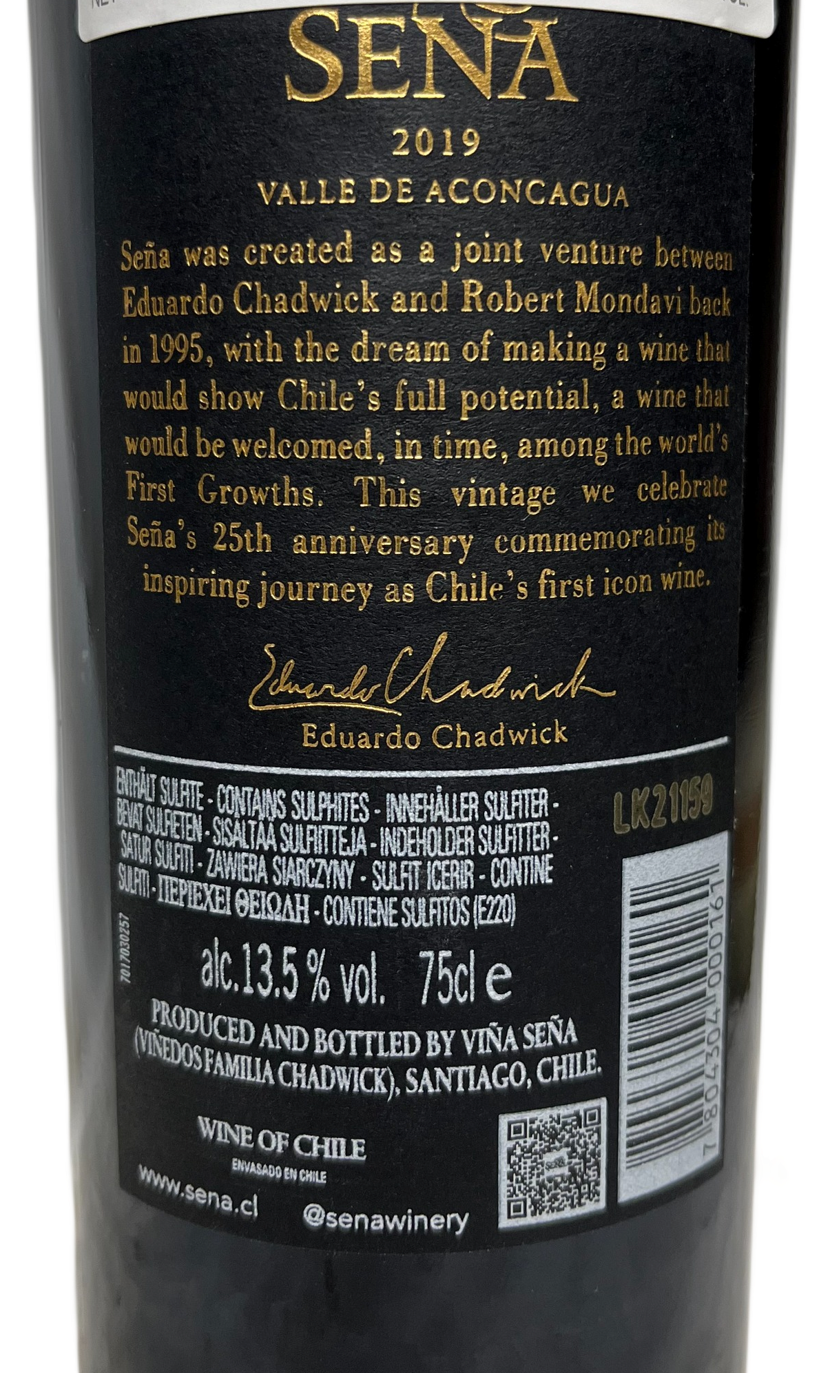 ["The 2019 Seña was produced with a Bordeaux blend of 60% Cabernet Sauvignon, 21% Malbec, 15% Carmenere and 4% Petit Verdot with the Chilean character of the high percentage of Carmenere. Most of the volume fermented in stainless steel with some 10% in co