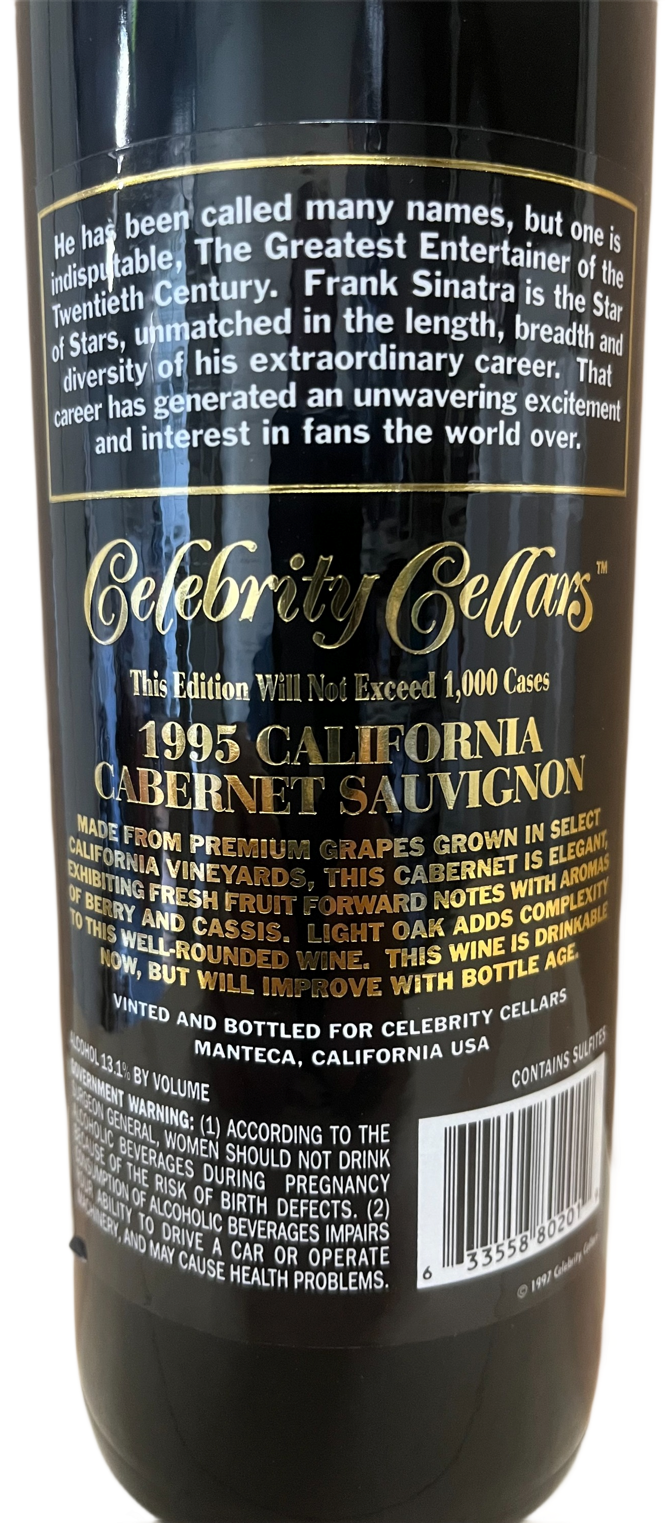 1995 Celebrity Cellars Frank Sinatra Proprietary Red Wine Etched Bottle