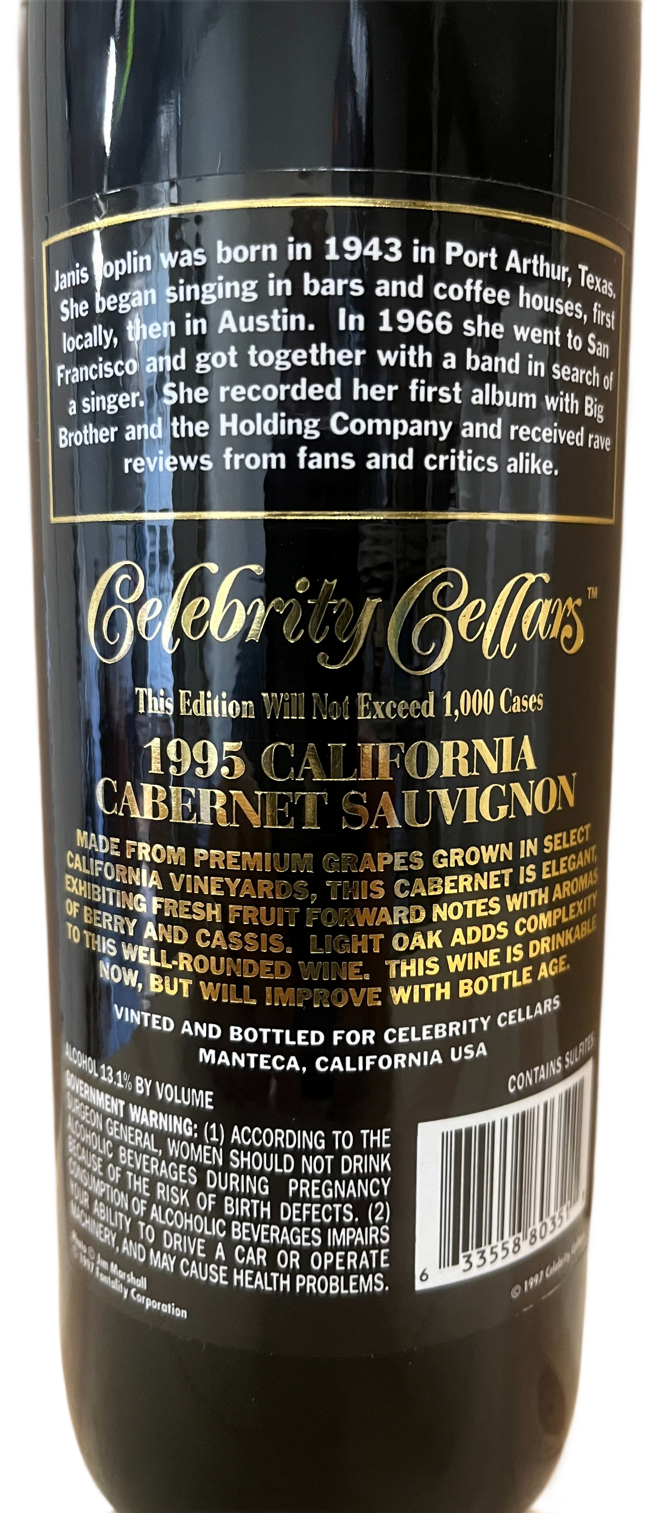 1995 Celebrity Cellars Janis Joplin Proprietary Red Wine Etched Bottle