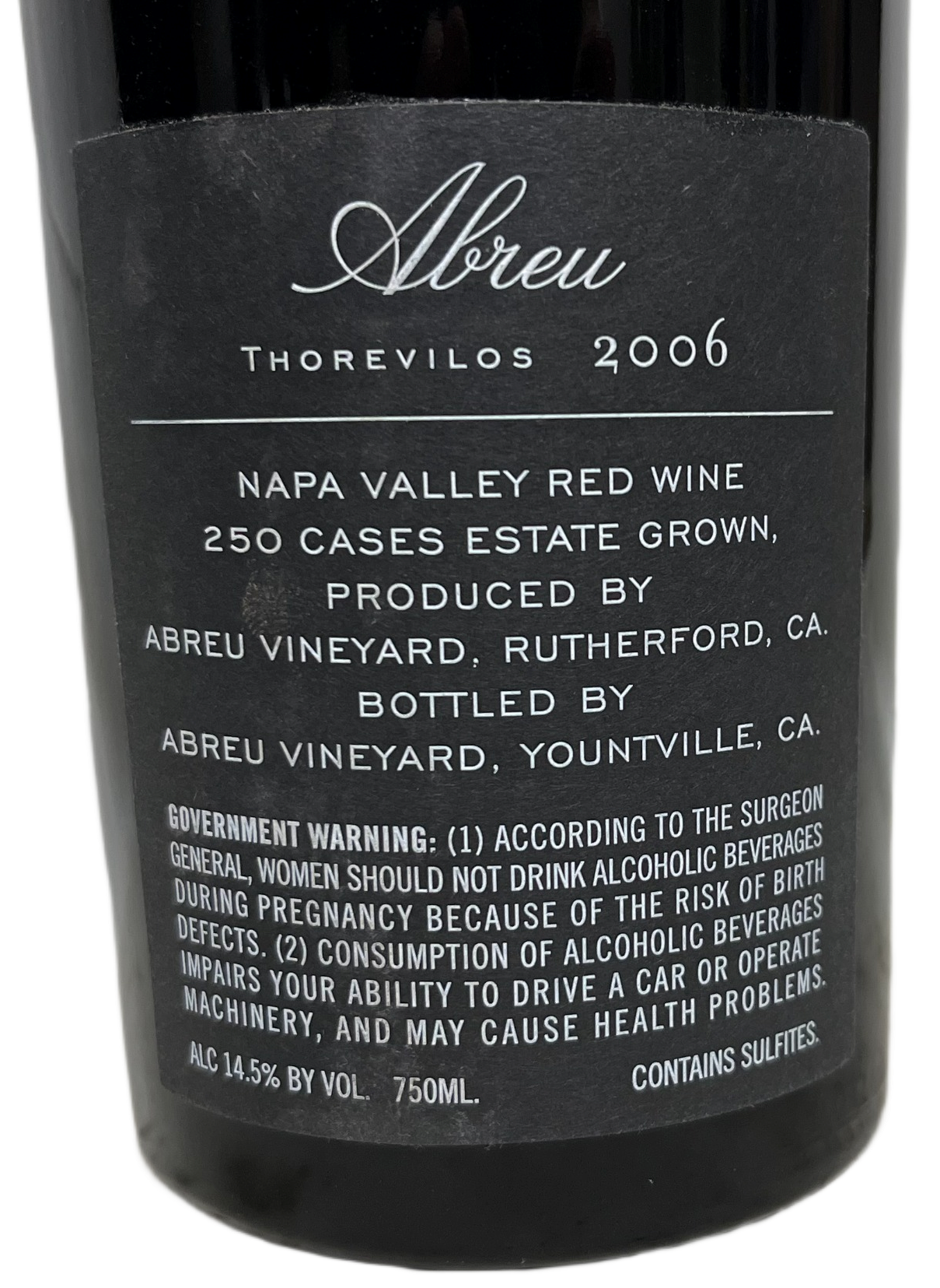 The 2006 Abreu Thorevilos Cabernet 750 ml is from the Napa Valley region of California. After the success of the Madrona Ranch launch, David Abreu planted the 22 acre Thorevilos vineyard in 1990. With volcanic rock and ash with red clay soils, the wines show more tobacco and smoke flavors than Abreu's other vineyards. Usually a blend of 45% Cabernet Sauvignon, 30-40% Cabernet Franc and the remainder Petit Verdot and Merlot, the Thorevilos wines are rich and elegant, just as winemaker, Brad Grimes, likes to make them.